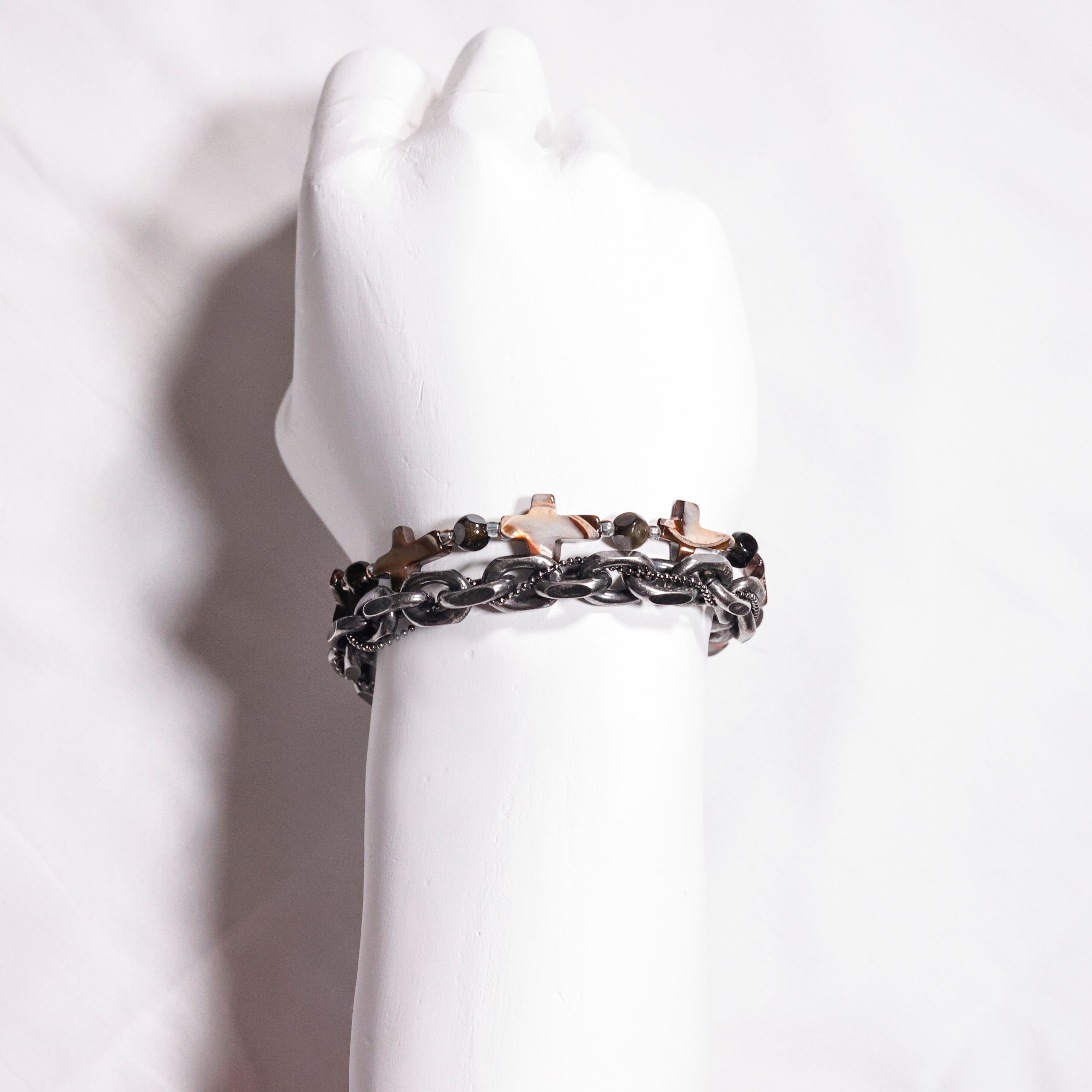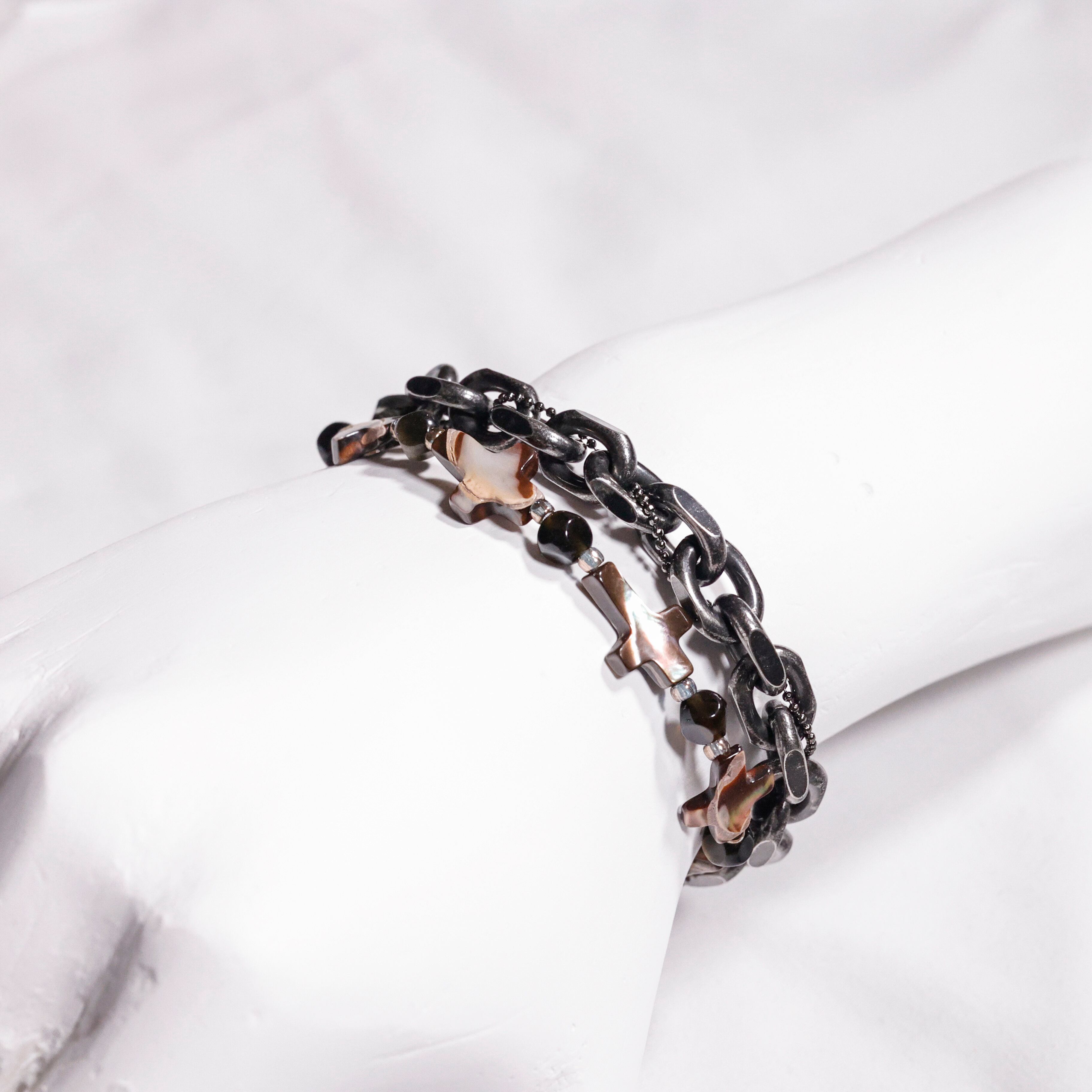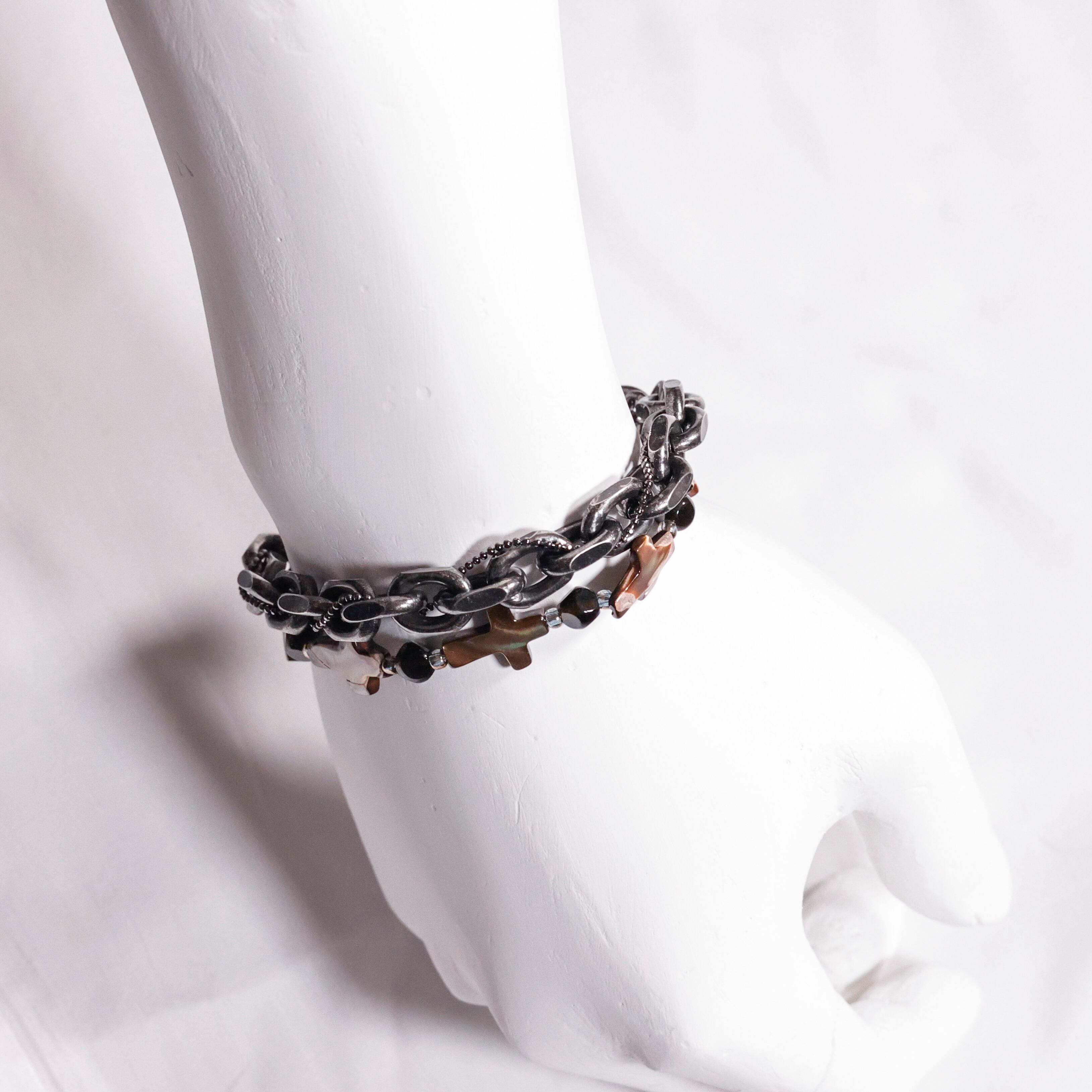 真珠を作り出す母貝である「マザーオブパール」をメインに使用した重厚感のあるハンドメイドのブレスレットです。無骨なステンレスと小さめのパーツを組み合わせることで中性的な雰囲気を演出しています。