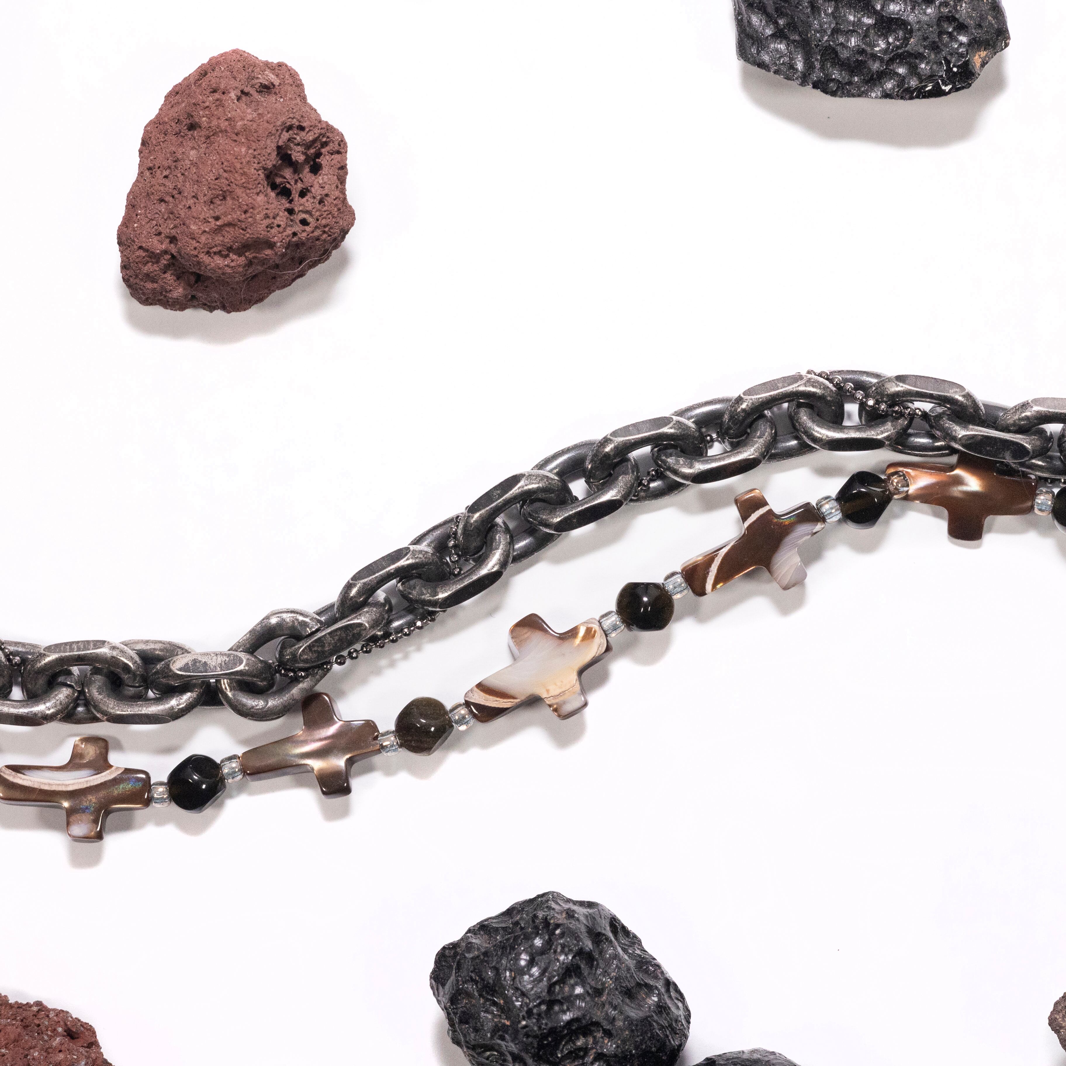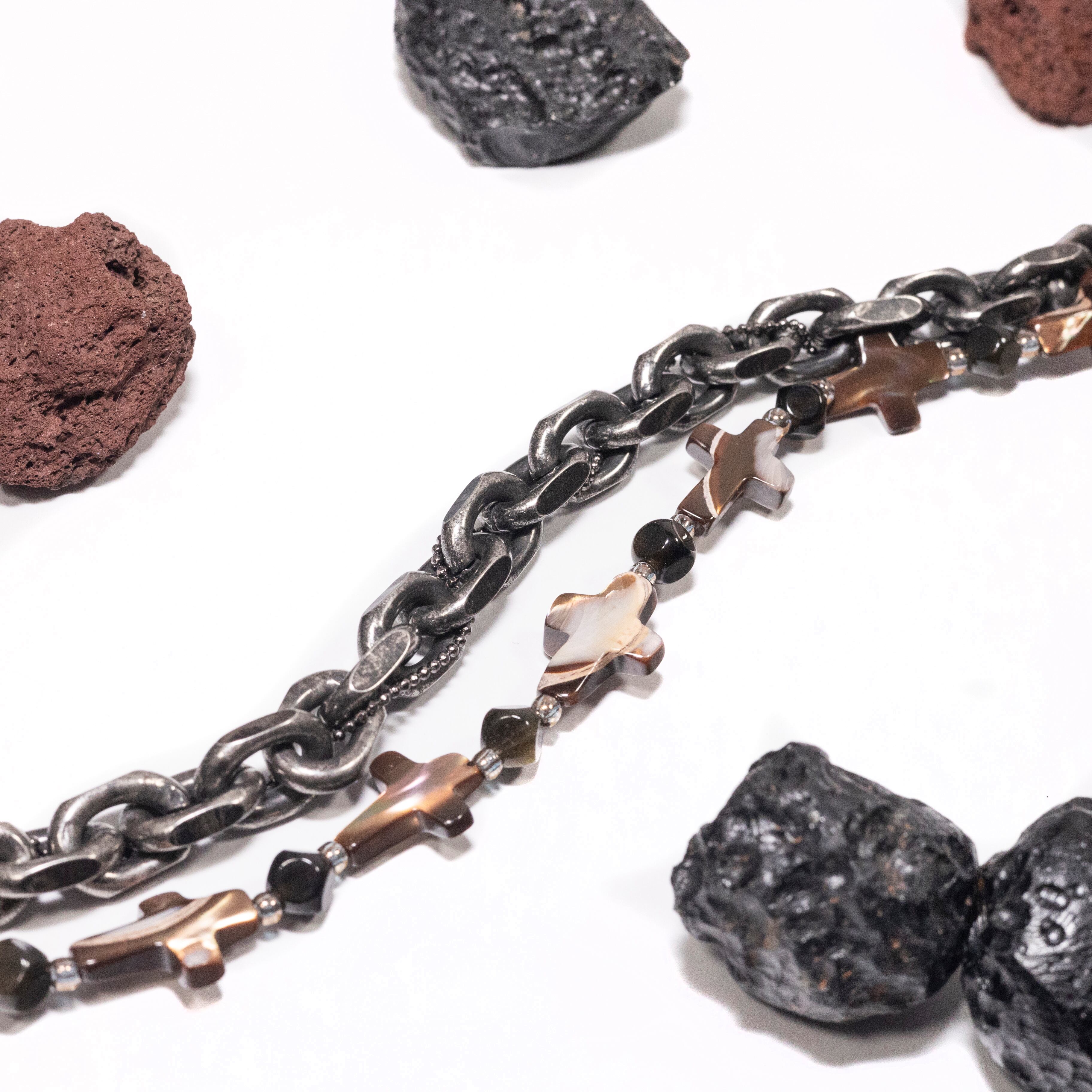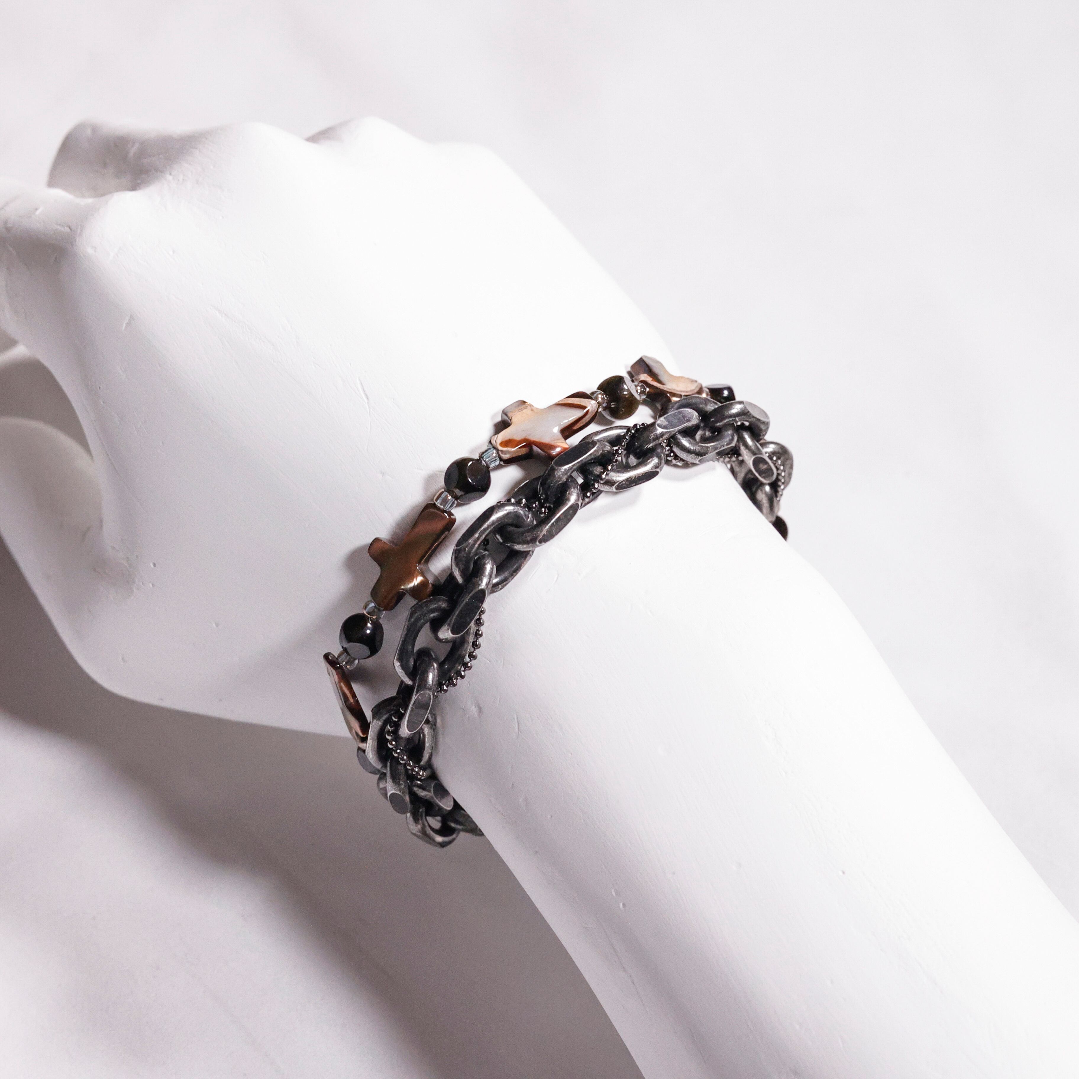真珠を作り出す母貝である「マザーオブパール」をメインに使用した重厚感のあるハンドメイドのブレスレットです。無骨なステンレスと小さめのパーツを組み合わせることで中性的な雰囲気を演出しています。
