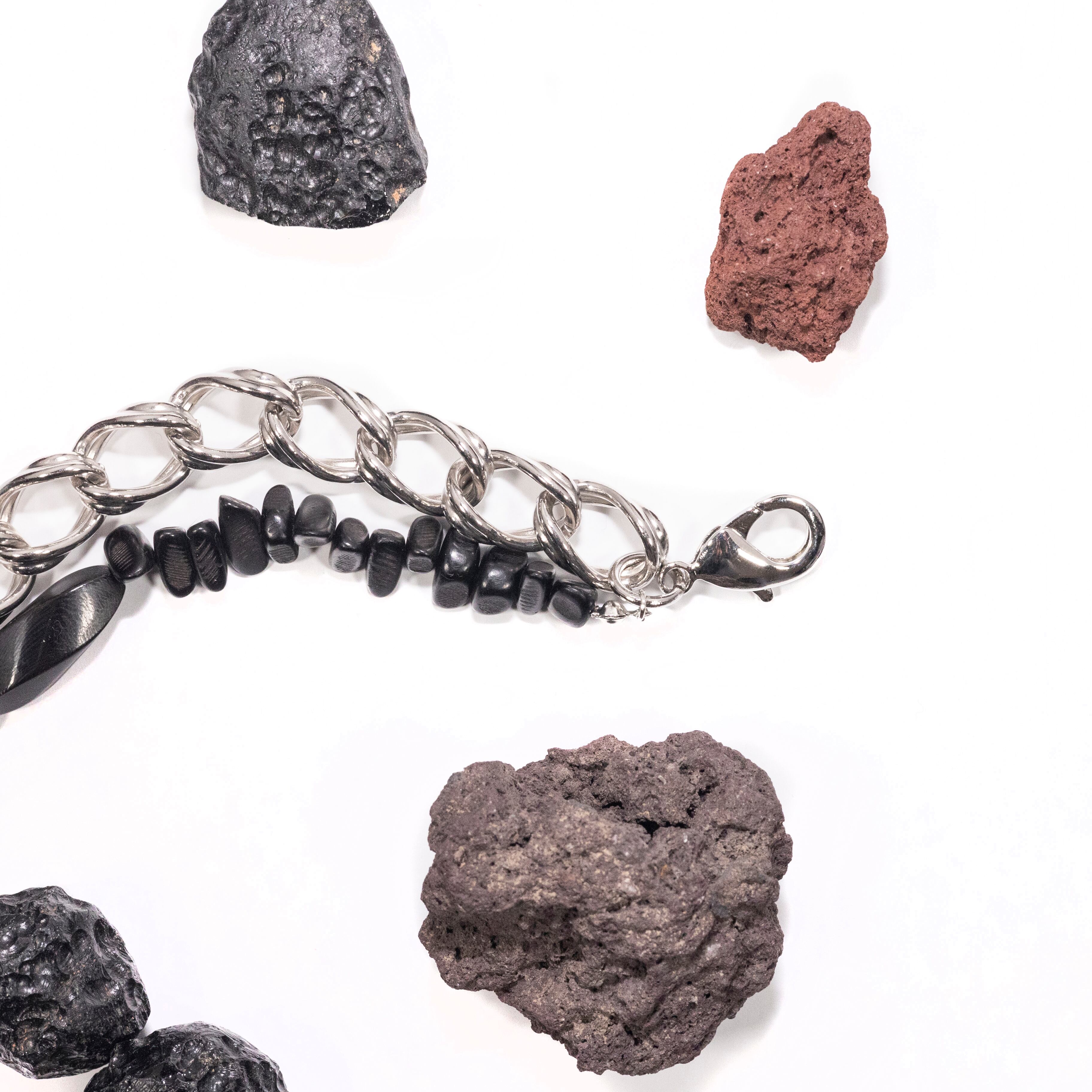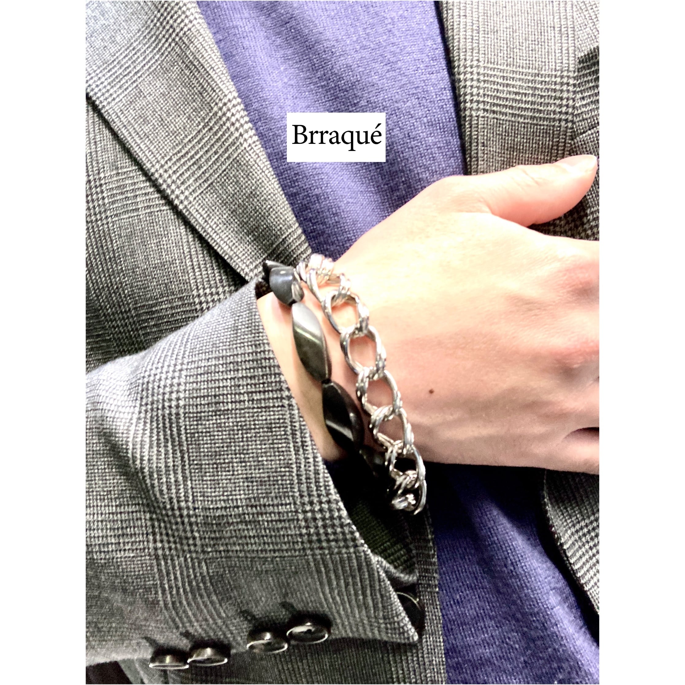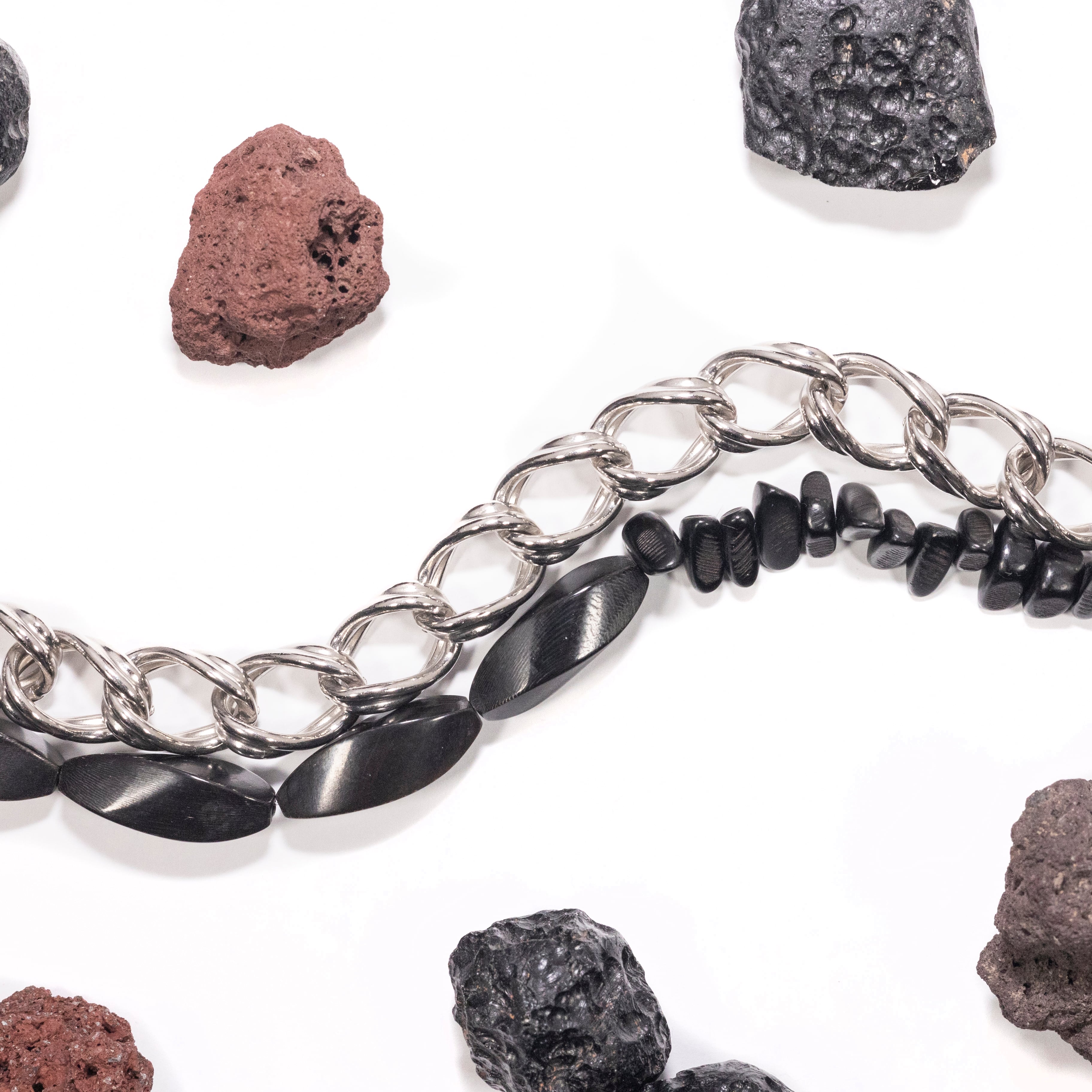 天然石は使用せず、バッファローの角を削ったビーズを使用。動物由来の有機的な質感と、大きめなチェーンの無機質な印象を掛け合わせることで、異素材のミクスチャーをお楽しみいただけます。