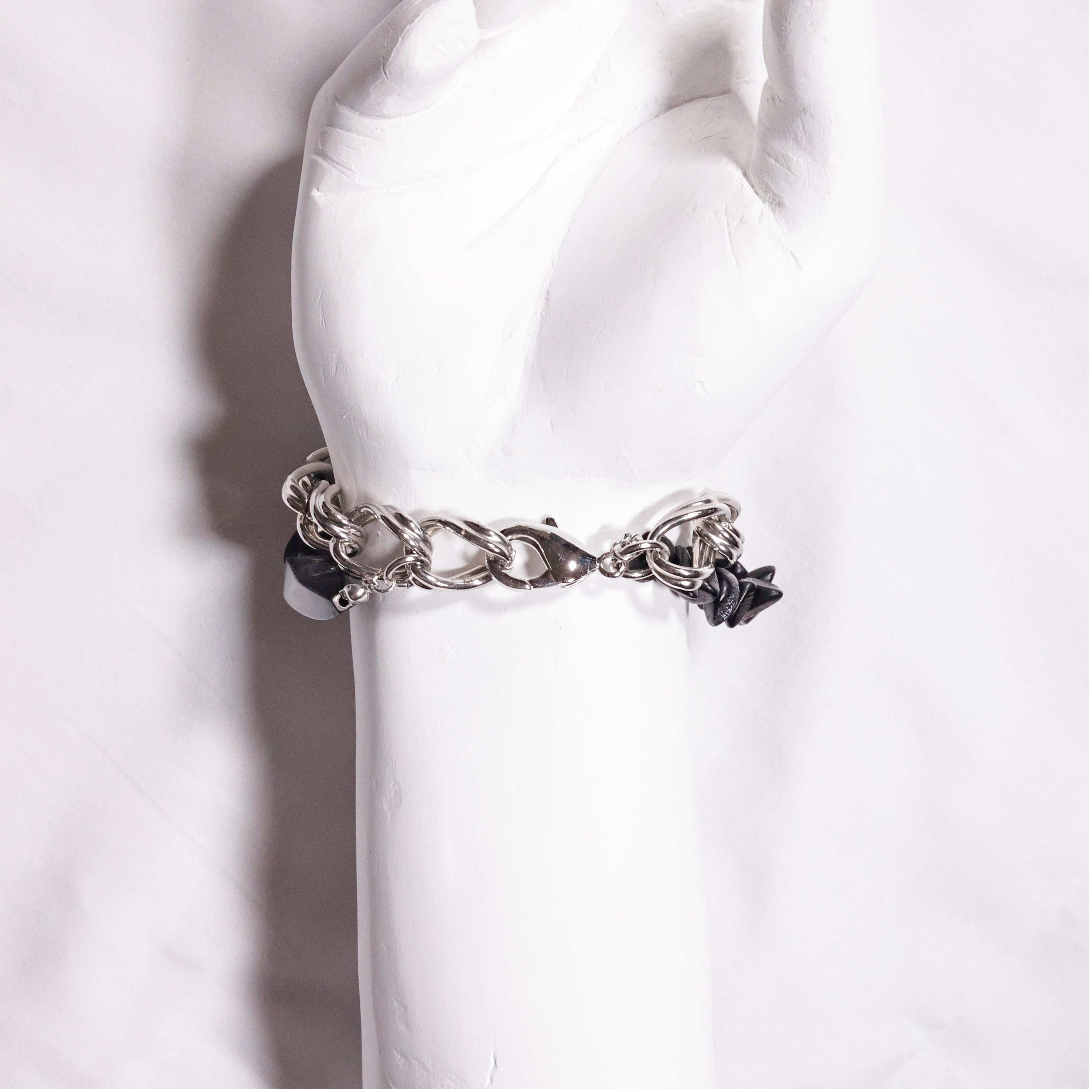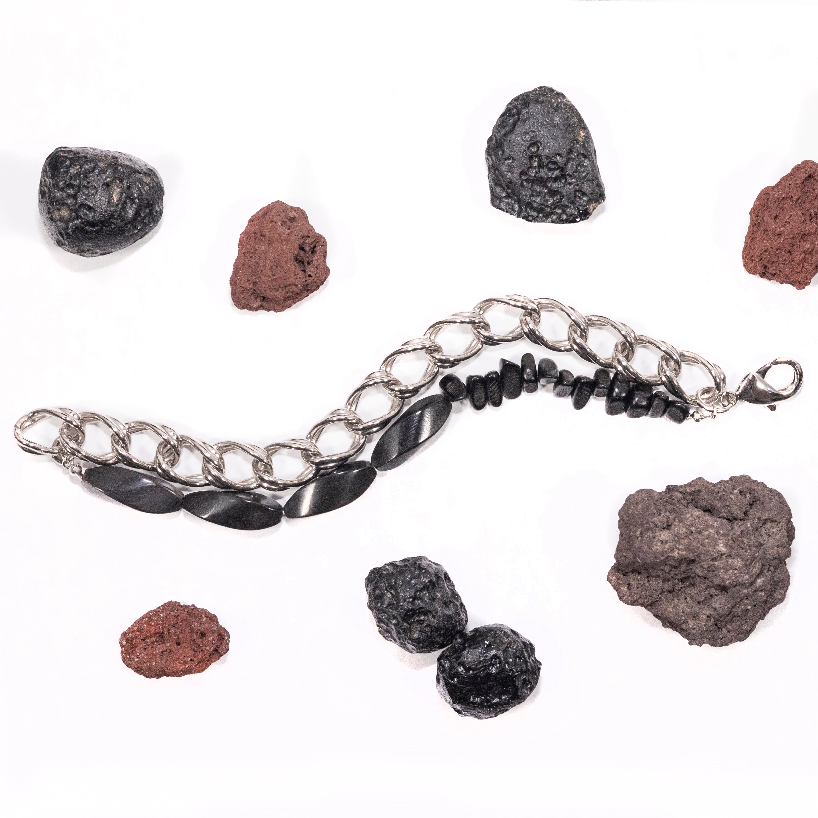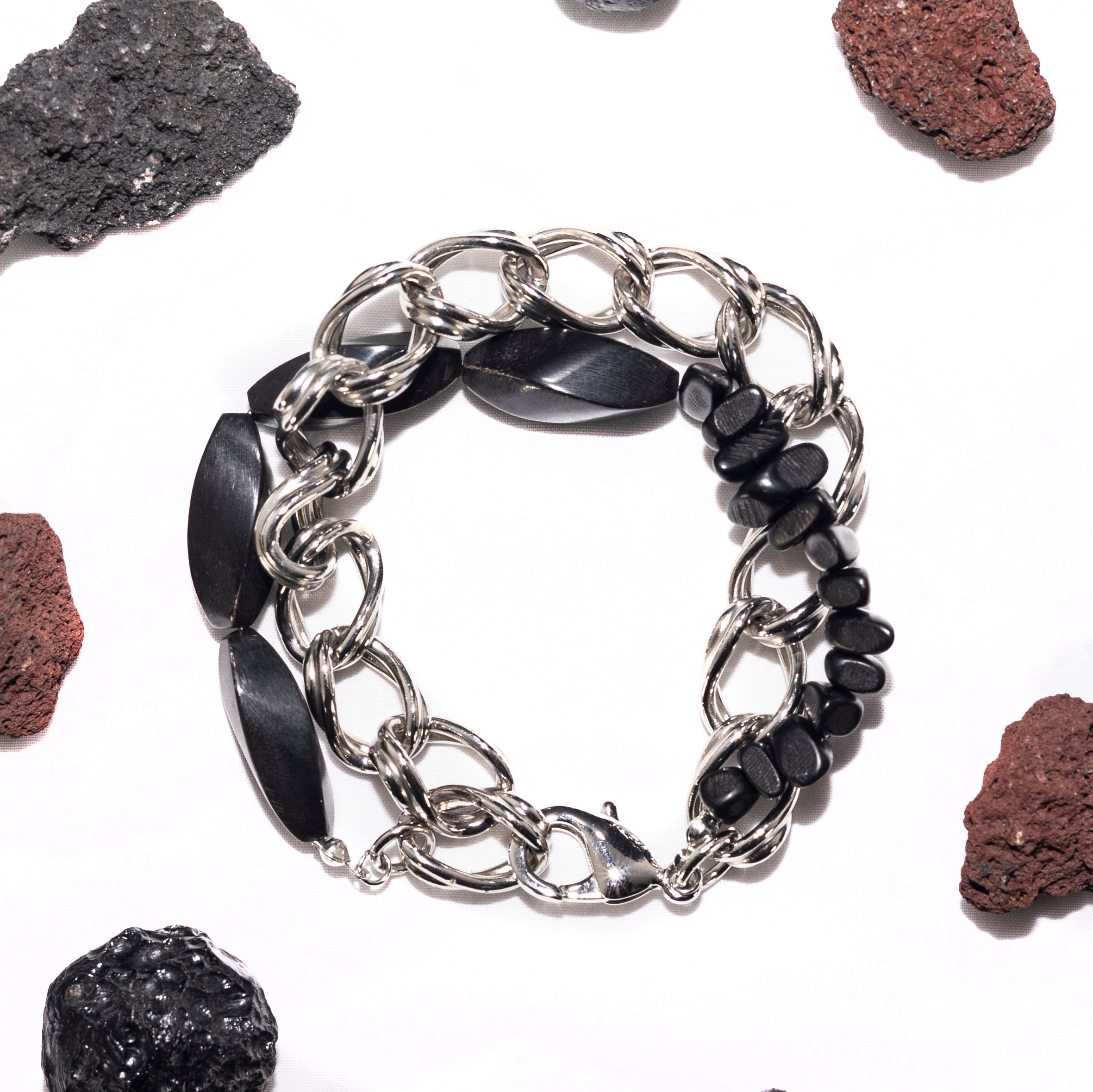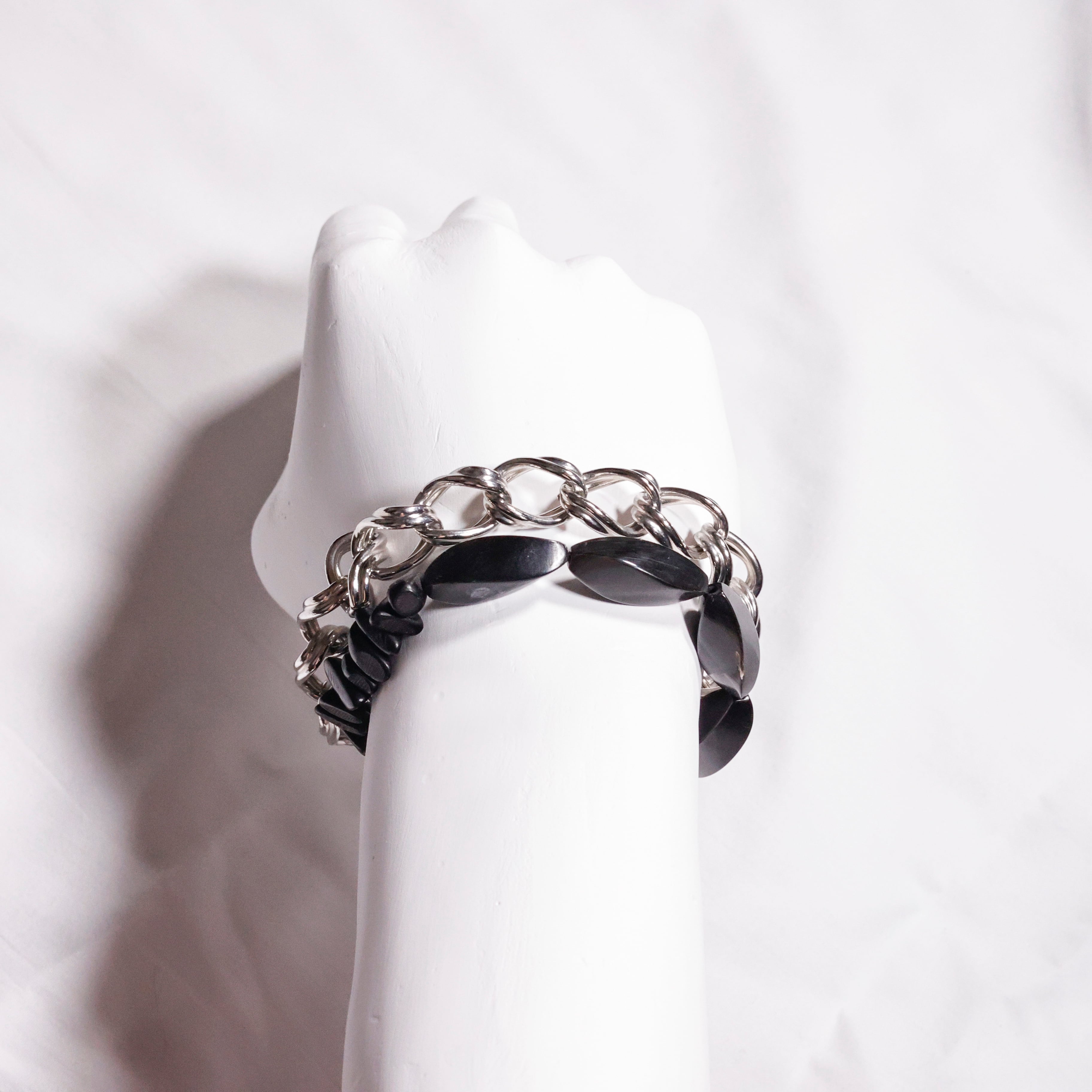 天然石は使用せず、バッファローの角を削ったビーズを使用。動物由来の有機的な質感と、大きめなチェーンの無機質な印象を掛け合わせることで、異素材のミクスチャーをお楽しみいただけます。