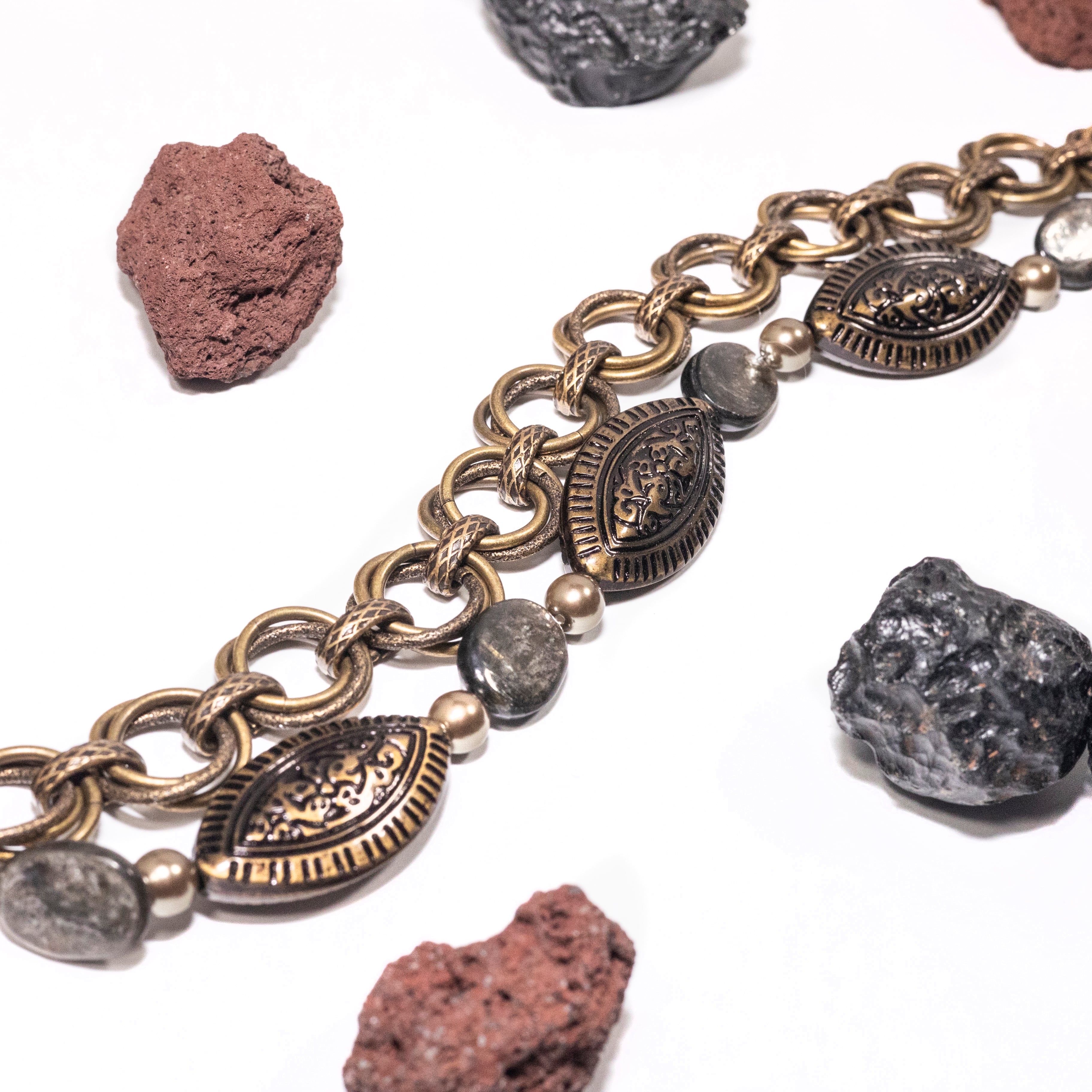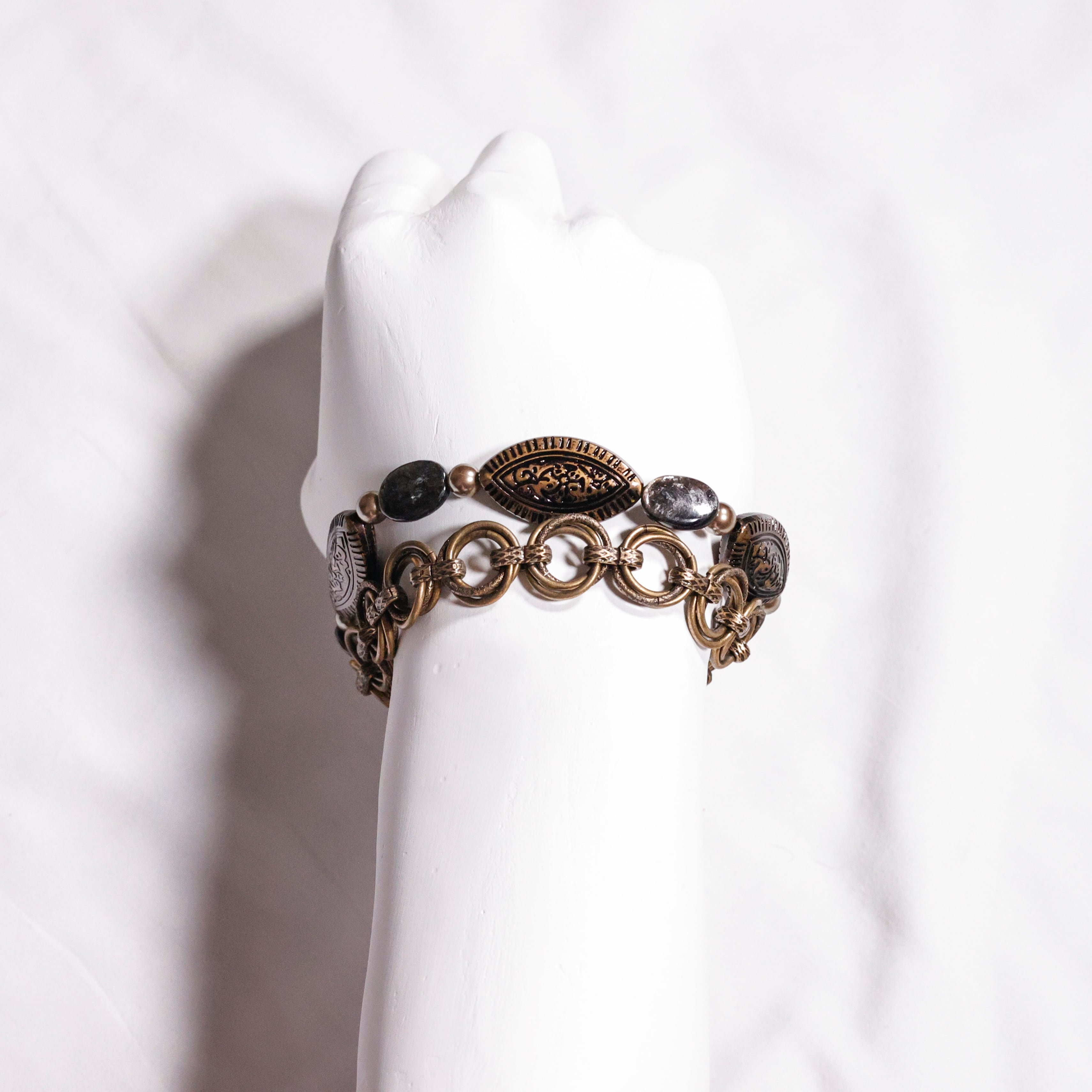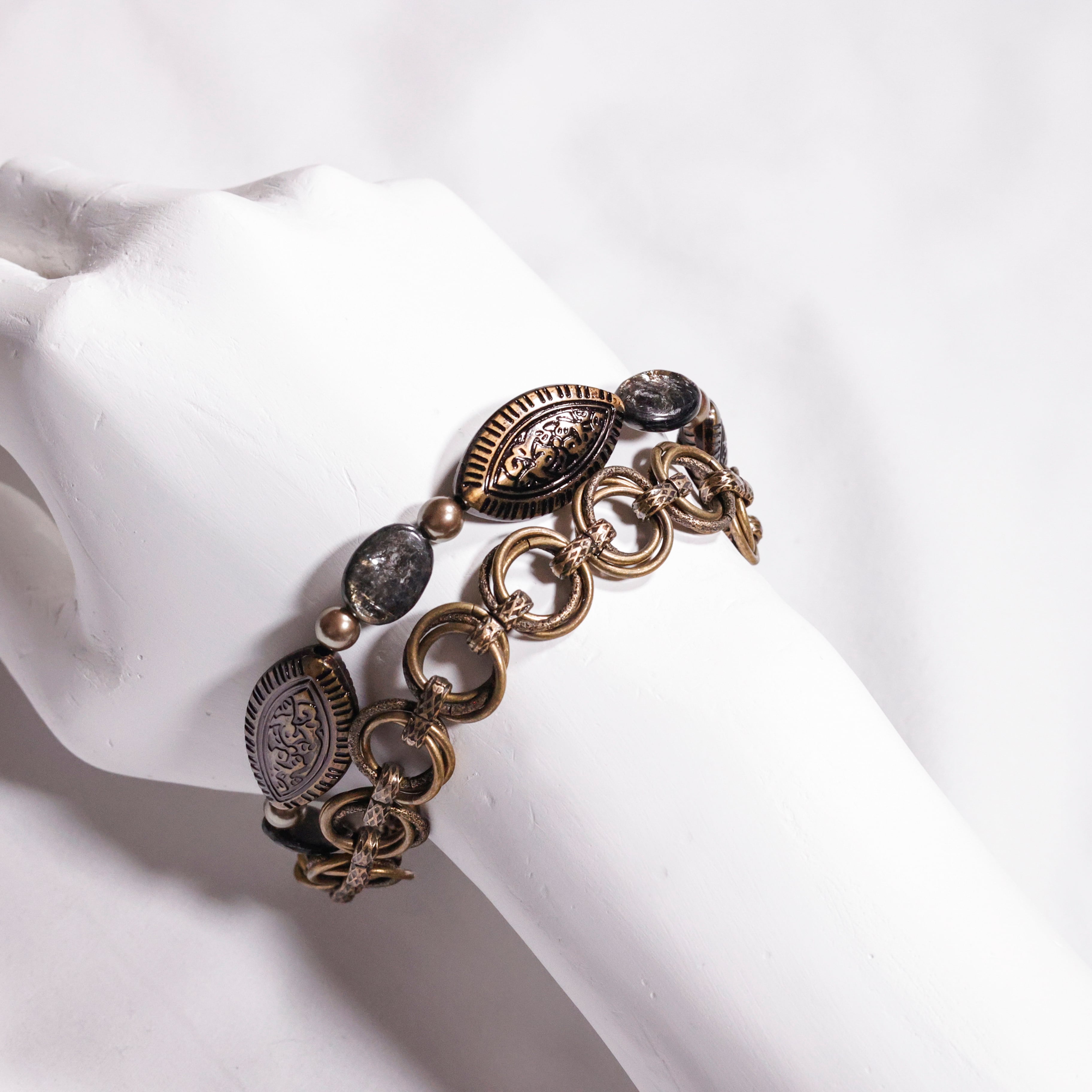 マットな質感の大粒チェコビーズをメインに、深い輝きをもつモスコバイトを添えたブレスレット。中世ヨーロッパのデザインをモチーフに、均整のとれた装飾性を意識したデザインに仕上げています。