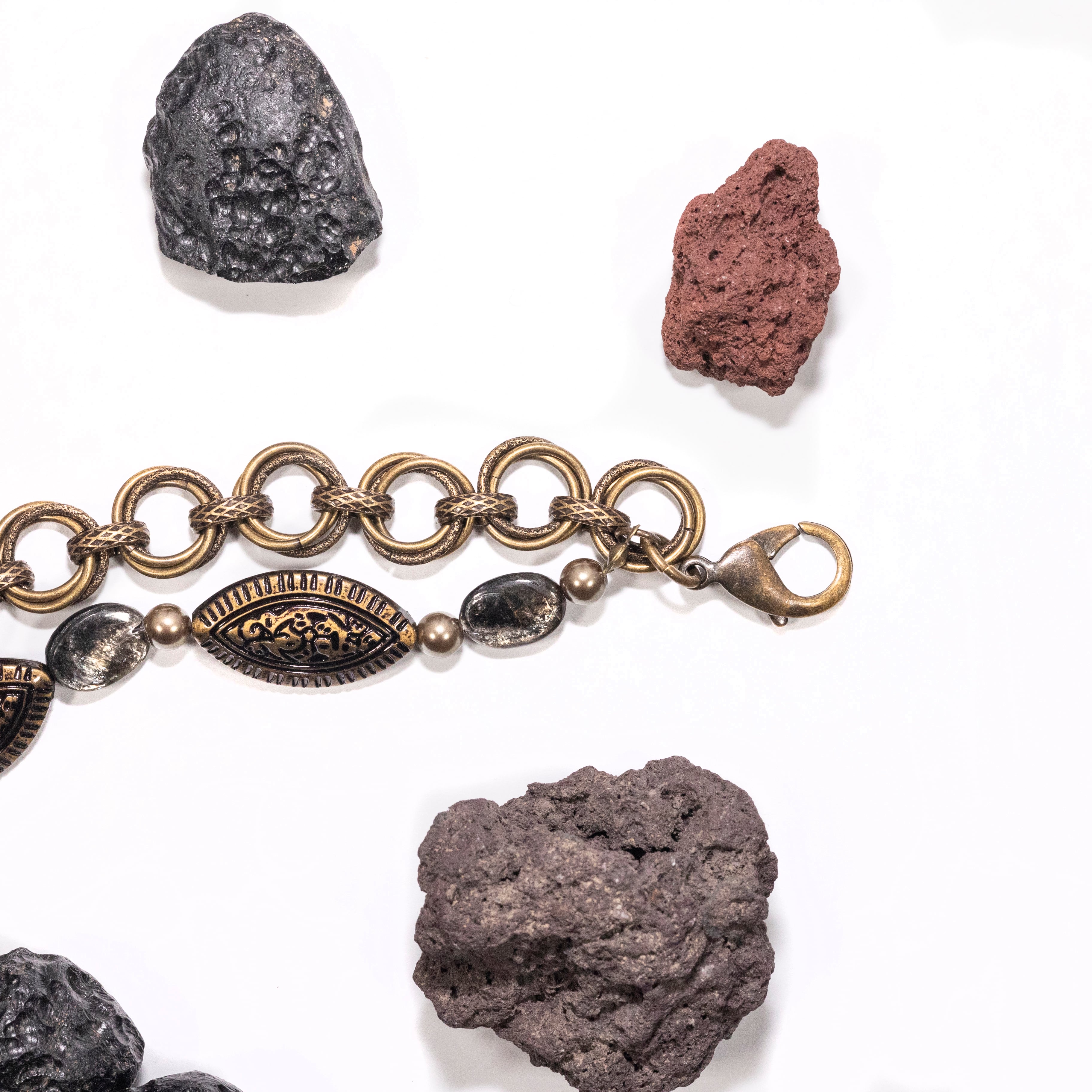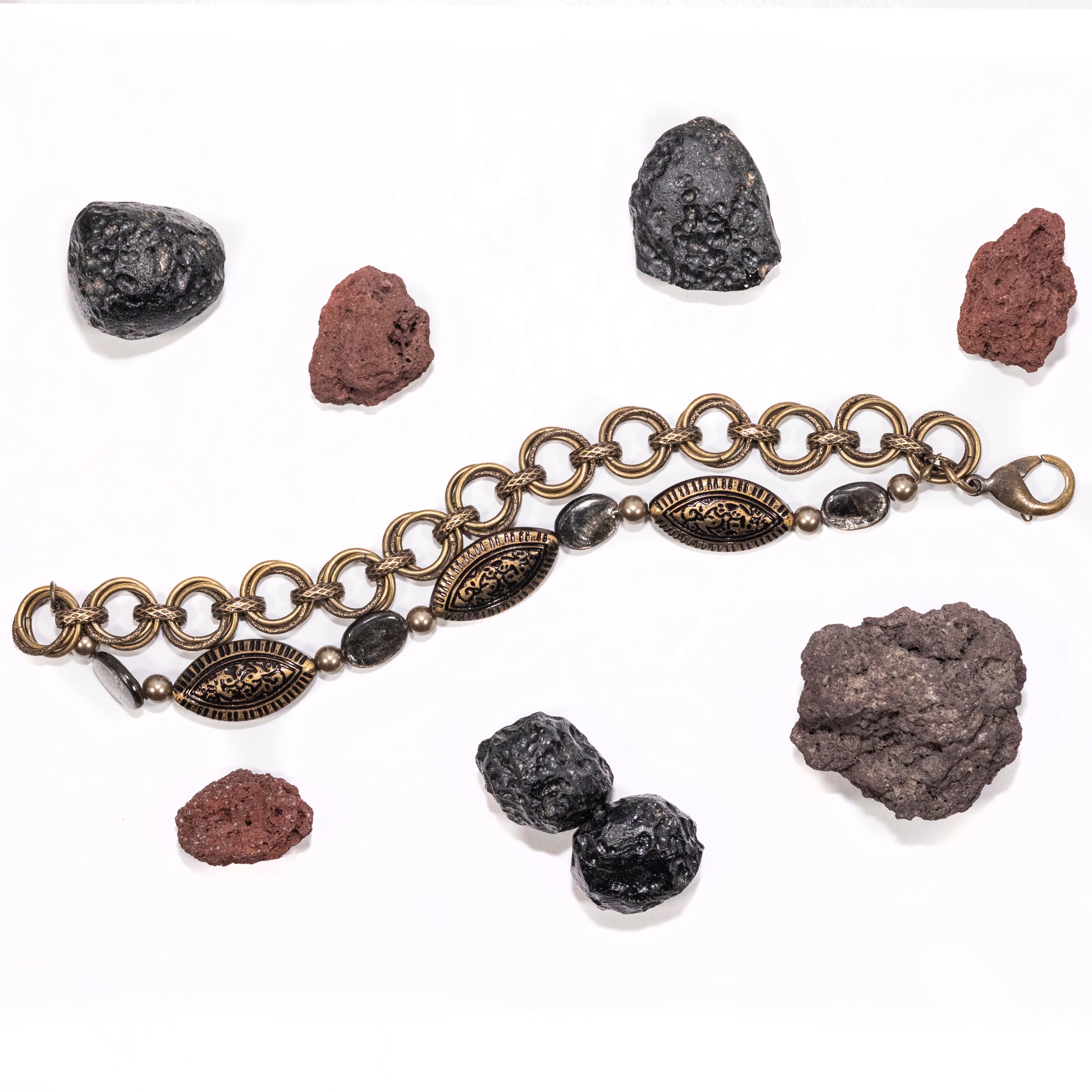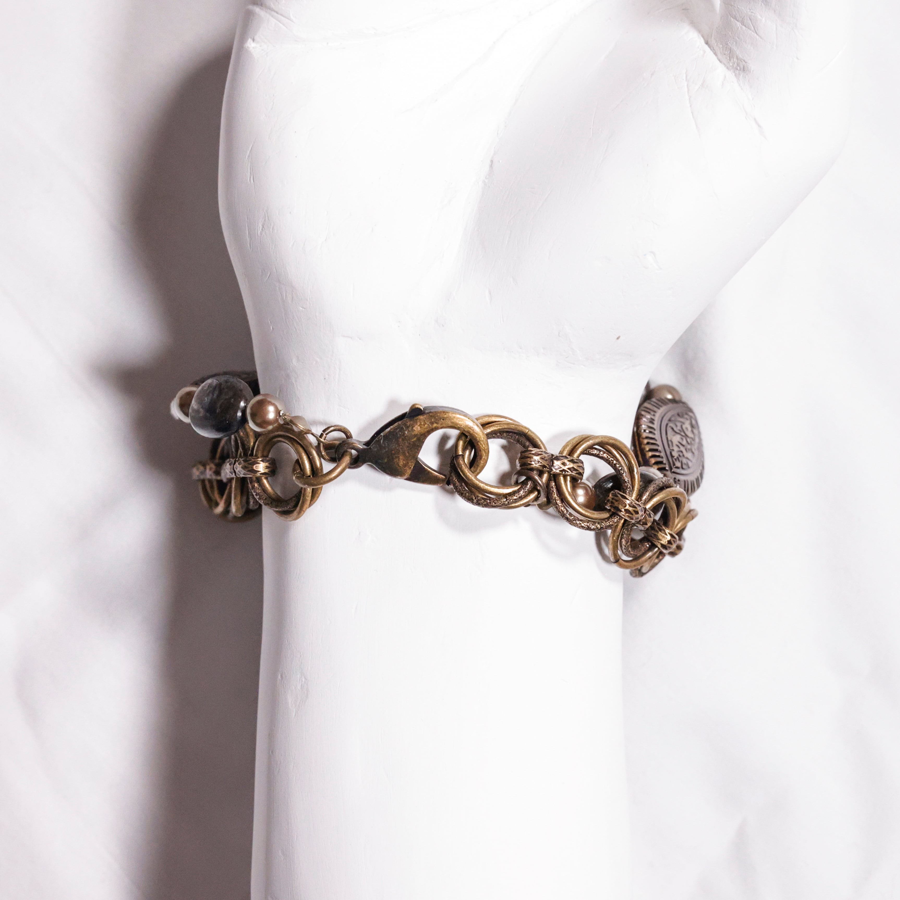 マットな質感の大粒チェコビーズをメインに、深い輝きをもつモスコバイトを添えたブレスレット。中世ヨーロッパのデザインをモチーフに、均整のとれた装飾性を意識したデザインに仕上げています。